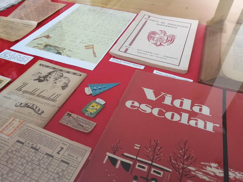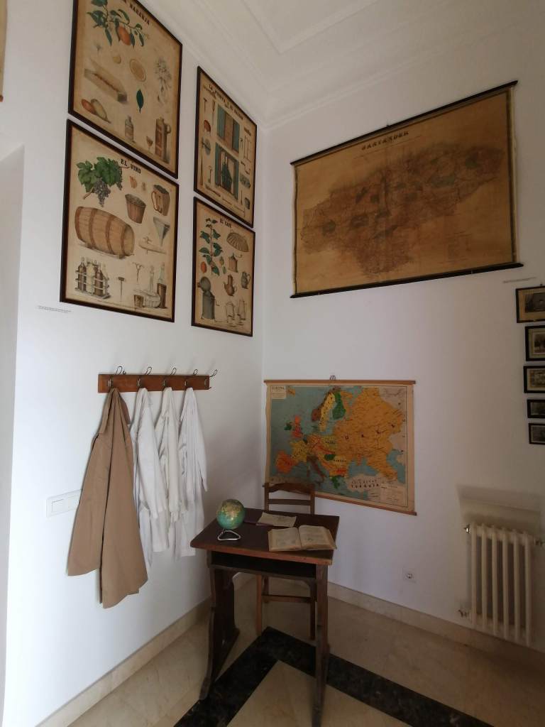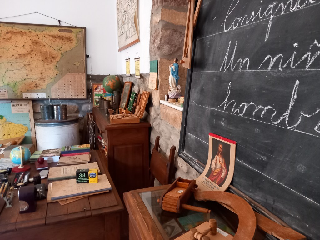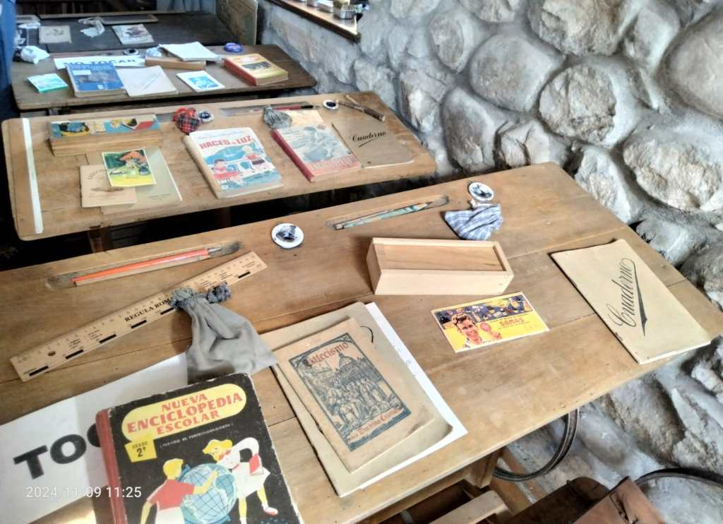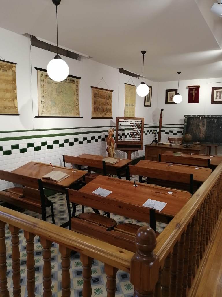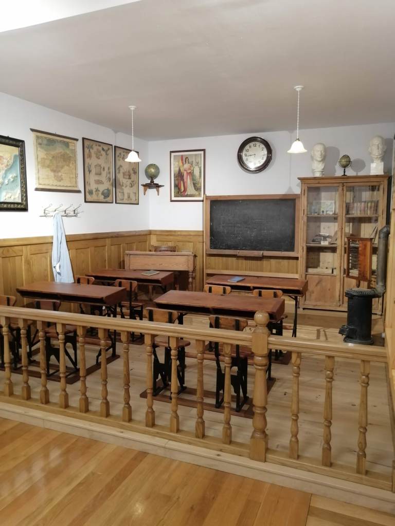 La escuela nos traslada a un aula de los años 40-50, donde podemos contemplar e incluso interactuar con el material escolar de la época: mapas, pizarrines, catecismos, plumines y un largo etc. El mobiliario escolar, formado por pupitres, mapas, pizarras y cuadros, junto con una amplia exposición de juguetes, nos traslada a otra época; la nostalgia y los recuerdos serán los protagonistas para muchos de sus visitantes. Una museografía didáctica que te da una visión completa de la educación en esta época, de sus métodos , y de la vida de los maestros y alumnos en un entorno rural.