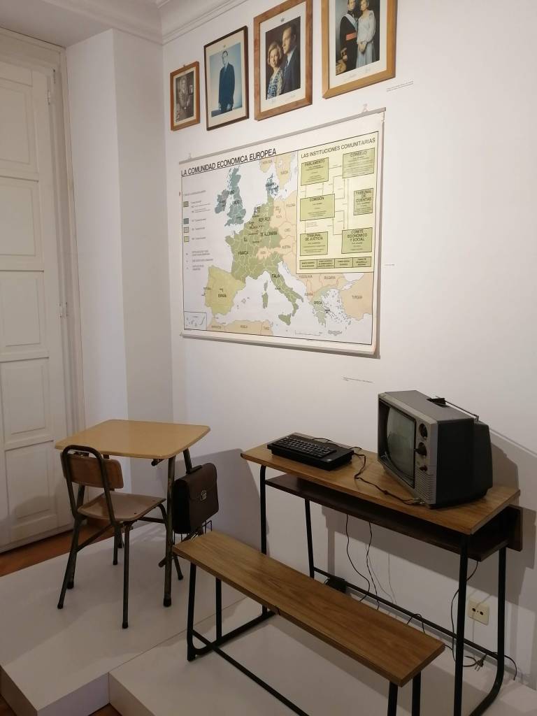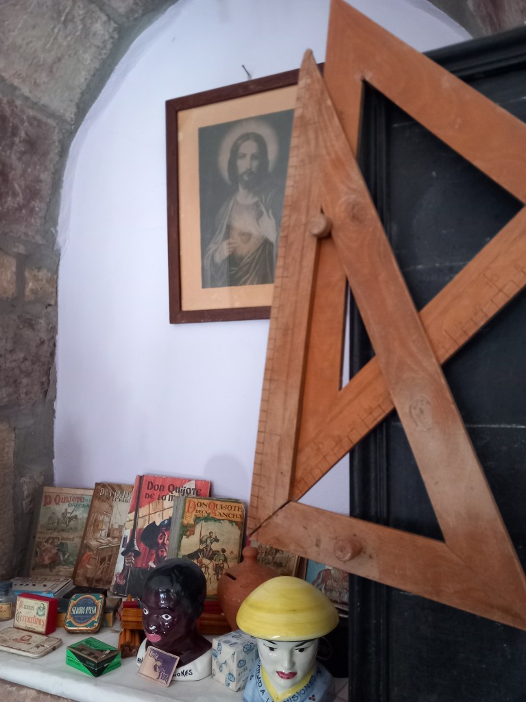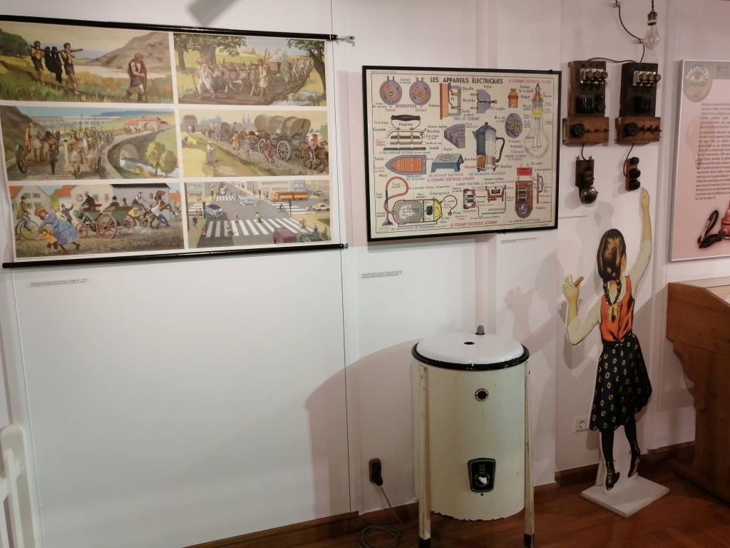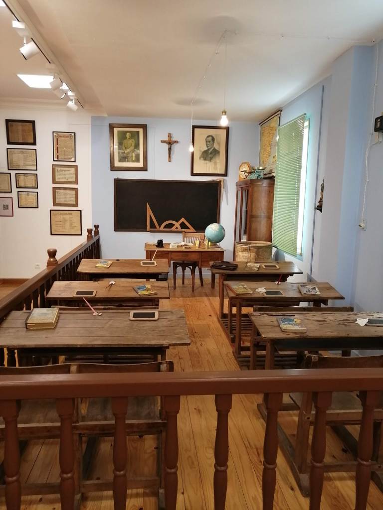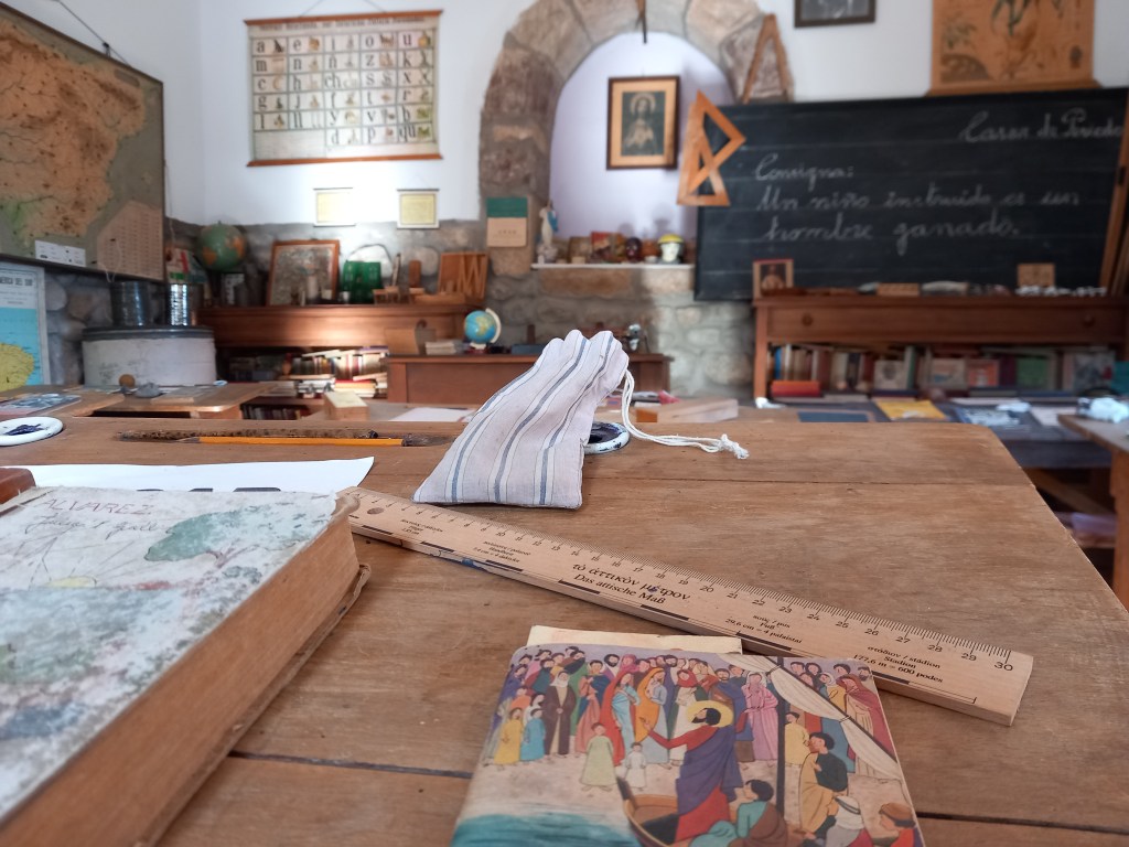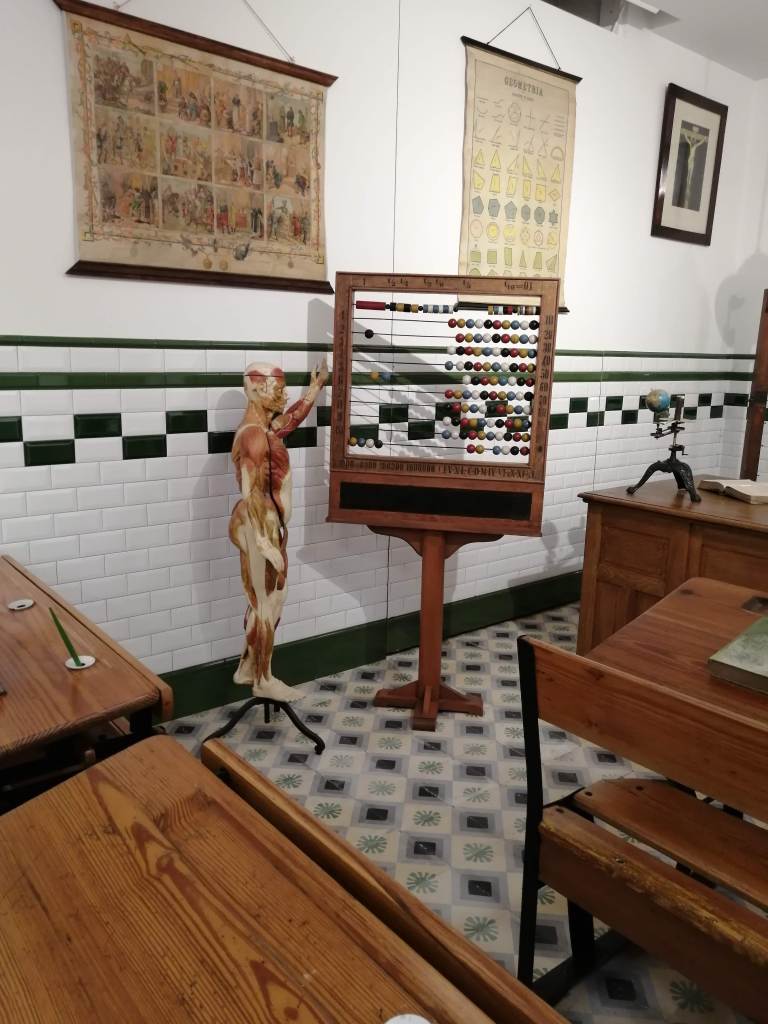 La escuela nos traslada a un aula de los años 40-50, donde podemos contemplar e incluso interactuar con el material escolar de la época: mapas, pizarrines, catecismos, plumines y un largo etc. El mobiliario escolar, formado por pupitres, mapas, pizarras y cuadros, junto con una amplia exposición de juguetes, nos traslada a otra época; la nostalgia y los recuerdos serán los protagonistas para muchos de sus visitantes. Una museografía didáctica que te da una visión completa de la educación en esta época, de sus métodos , y de la vida de los maestros y alumnos en un entorno rural.